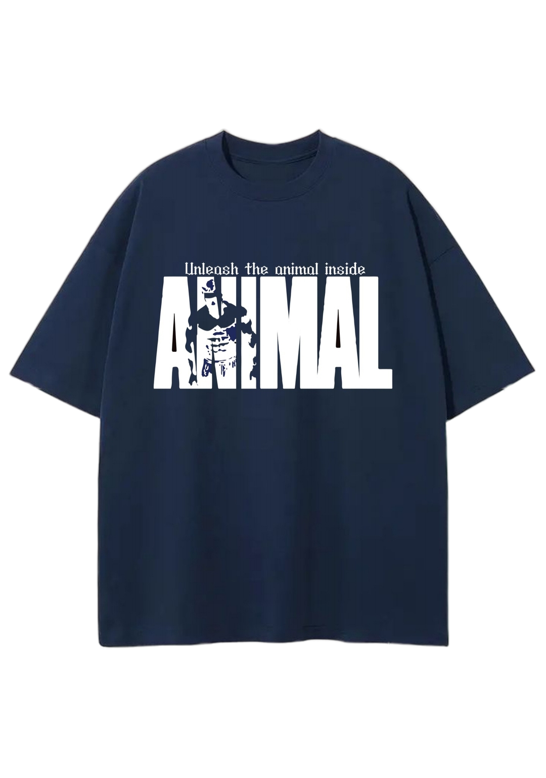 A bold declaration — “Unleash the animal inside” sits atop the powerful "ANIMAL" print, featuring a gritty silhouette of a muscle-bound figure breaking through the text. It’s a mindset, not just a message.