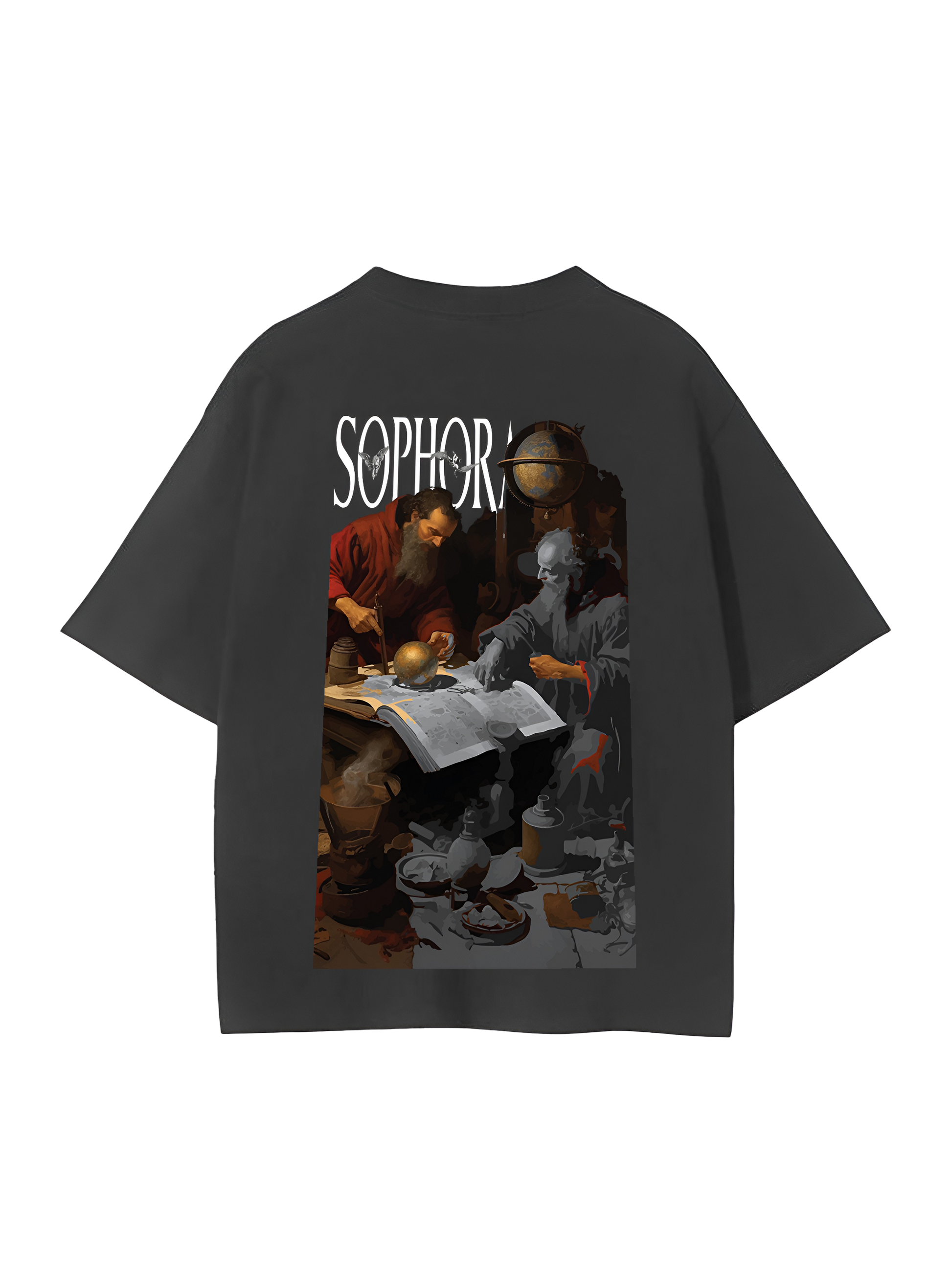 Step into a world of intellectual pursuit with our "Sophora" Graphic T-Shirt. This striking black tee features an ornate print that artfully captures the essence of scholarly conversation, inspired by timeless masterpieces.